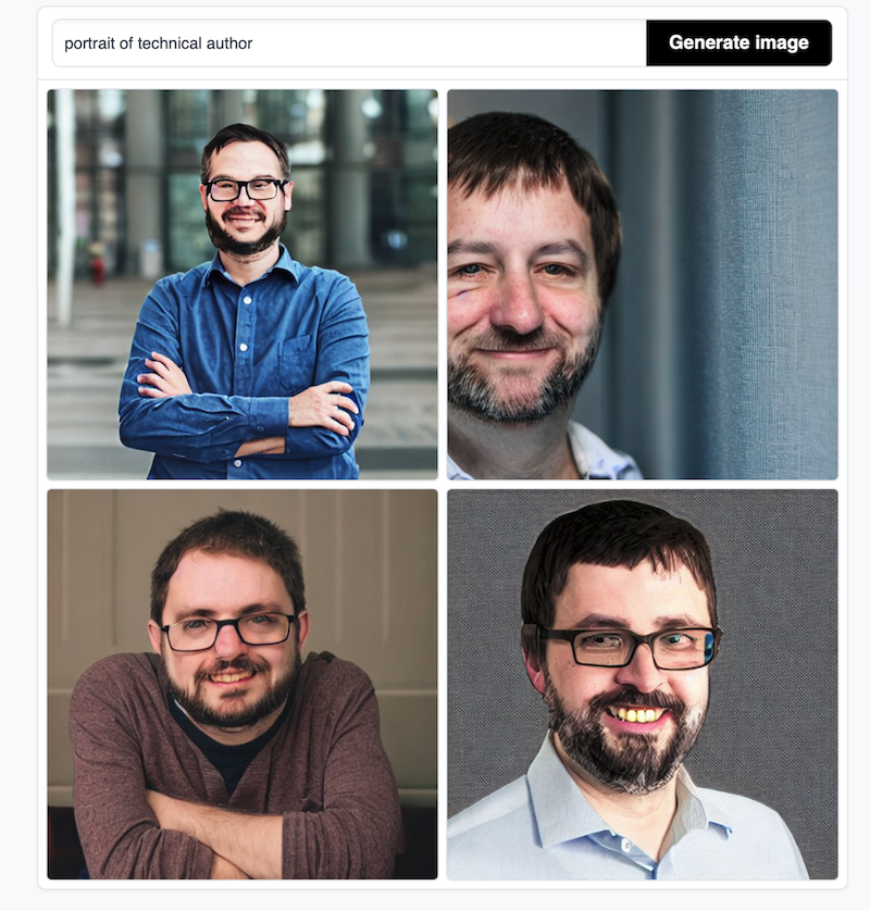 While working with my colleague Mike Mason on a forthcoming article, we asked Stable Diffusion to come up with portraits of technical authors. We thought the results were worth sharing.