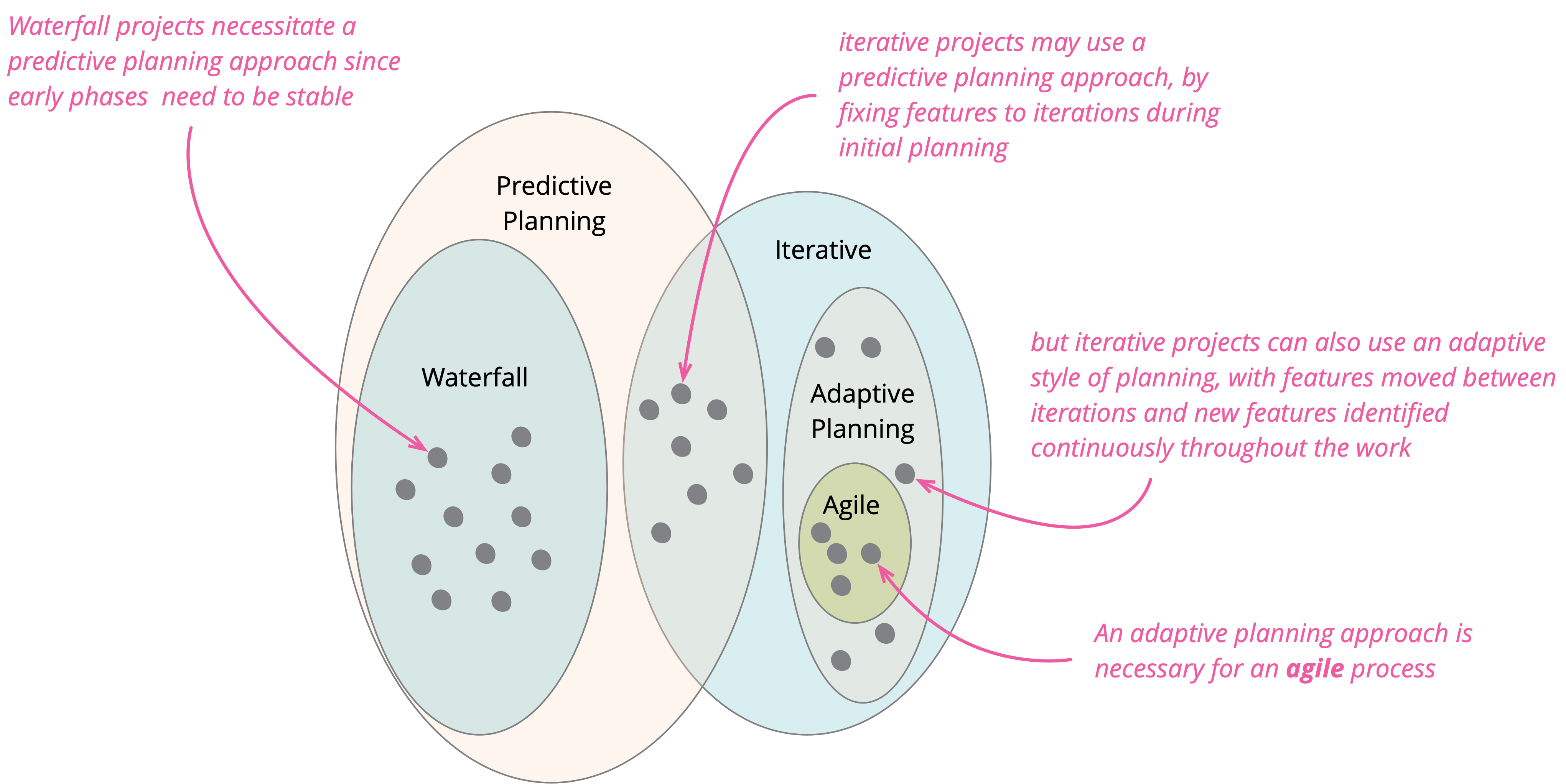 Waterfall is often cast as the alternative to agile software development, but I don't see that as strictly true. Certainly agile processes require an iterative approach and cannot work in a waterfall style. But it is easy to follow an iterative approach (i.e. non-waterfall) but not be agile. 5 I might do this by taking 100 features and dividing them up into ten iterations over the next year, and then expecting that each iteration should complete on time with its planned set of features. If I do this, my initial plan is a predictive plan, if all goes well I should expect the work to closely follow the plan. But adaptive planning is an essential element of agile thinking. I expect features to move between iterations, new features to appear, and many features to be discarded as no longer valuable enough.